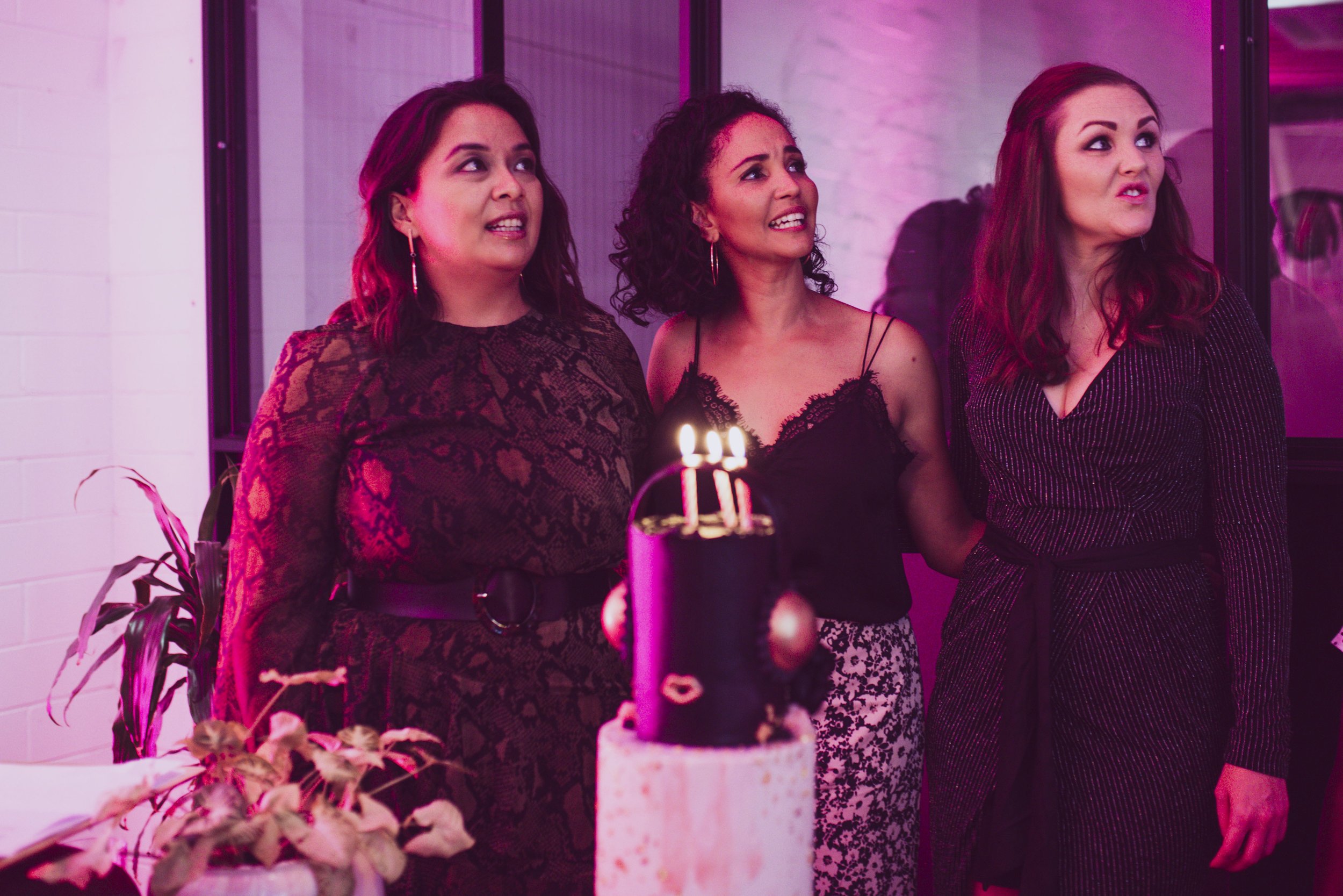 Pink bubbles accompanied gourmet canapés including basil crusted tuna tartare cones and miniature haloumi tacos. The podcast hosts blew the candle on a sleek, 2 tiered Friday’s Cake mud cake adorned with gold headphones to officially launch the event tip extravaganza.